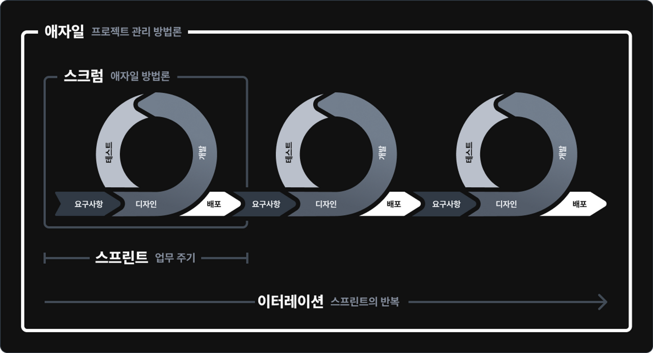 - 스크럼 : 스프린트 안에서 제품을 개발하는 방식