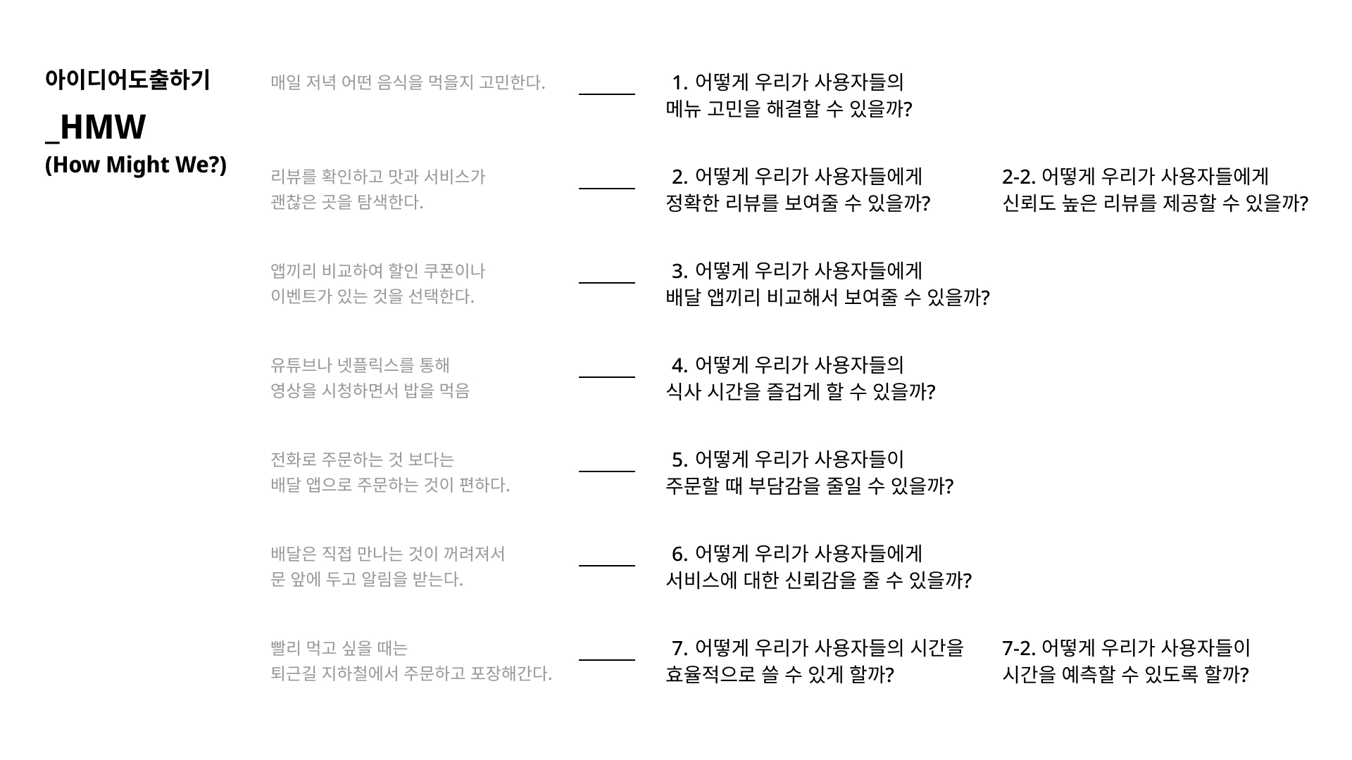 디자인씽킹 프로세스를 활용해 음식 배달/외식 시장에 필요한 아이디어를 도출해 보세요.