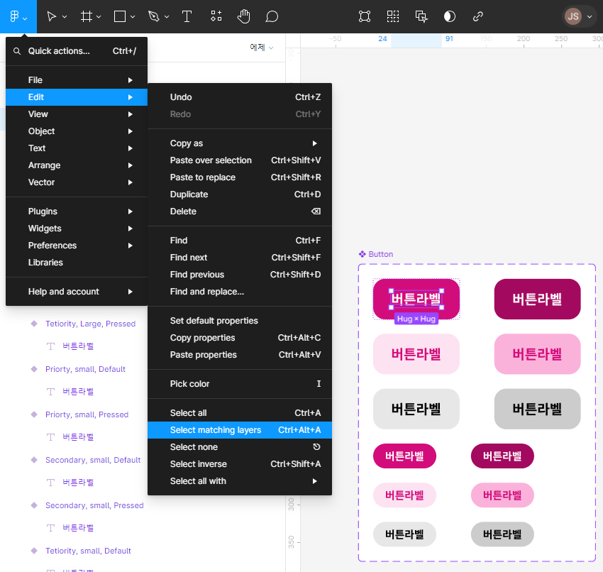 - 전체 선택 후, states, default값의 배리언츠를 추가한다.