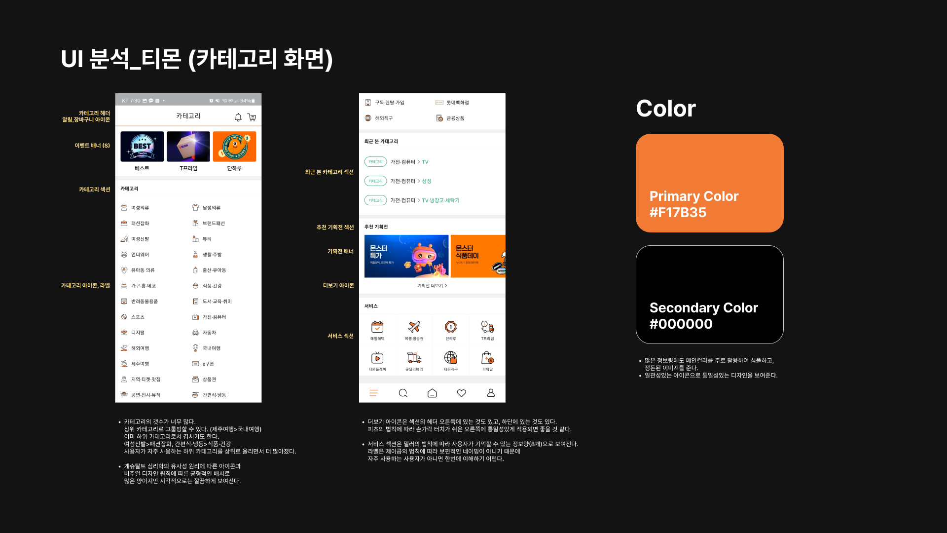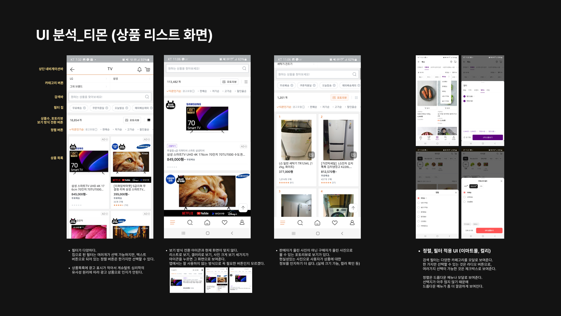 화면별로 하나씩 나눠서 경쟁사 공통점/차이점 분석 및 주로 쓰이는 UI 패턴 정리