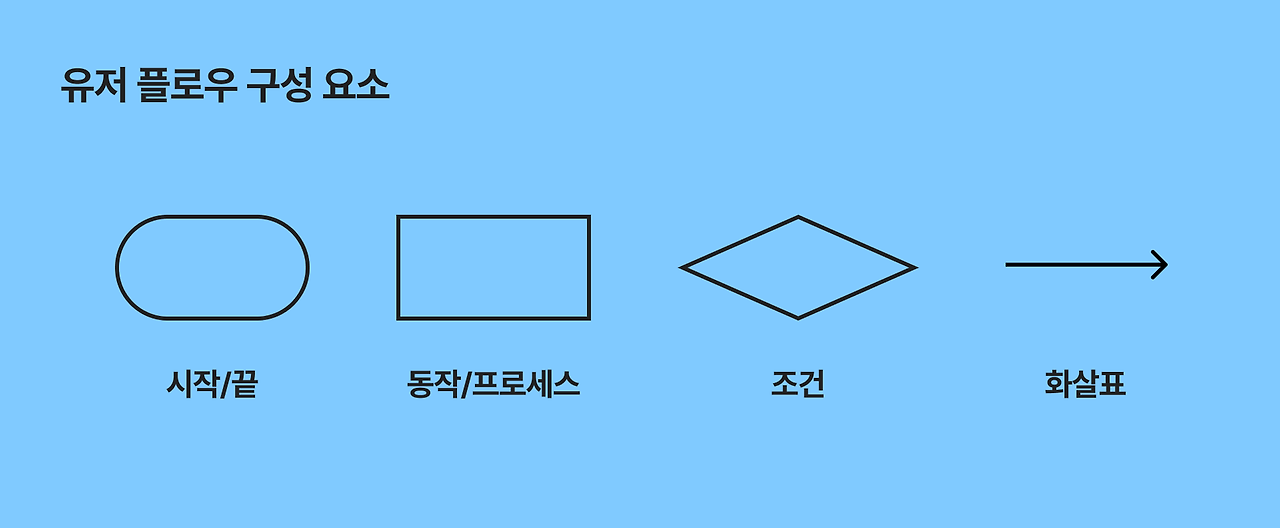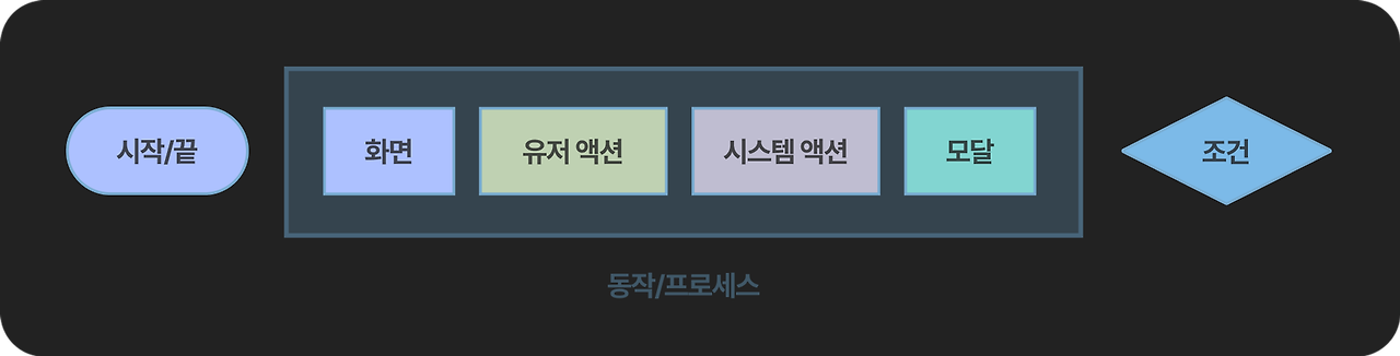 화면, 유저 액션, 시스템 액션, 모달의 경우 색상으로 구분하여 이해도를 높일 수 있음